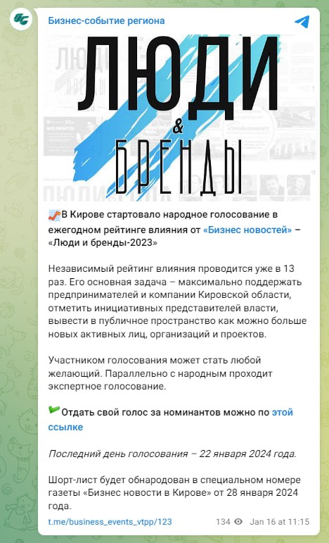«Друзья, в Кирове проходит голосование «Люди и бренды -2023», лидера нашего сообщества Сунцова Алексея Владимировича представили в номинации «Лидеры малого бизнеса». Сделайте выбор. Выбирайте сердцем. В списках много знакомых и успешных людей нашего города!»