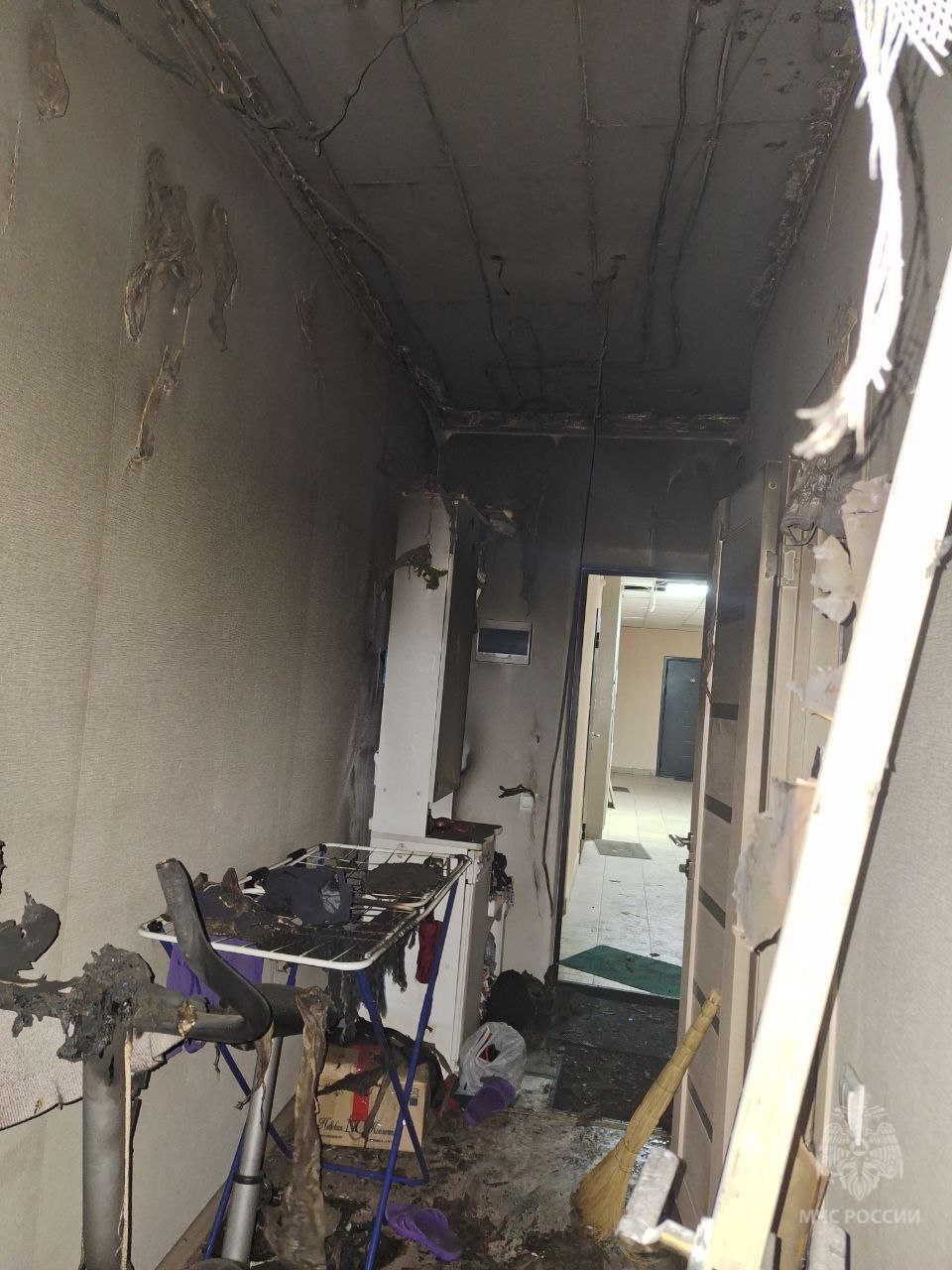 4 единицы техники МЧС и 15 человек выдвинулись на место происшествия. В квартире никого не было. Пожарные вскрыли дверь квартиры и потушили потолок в коридоре.