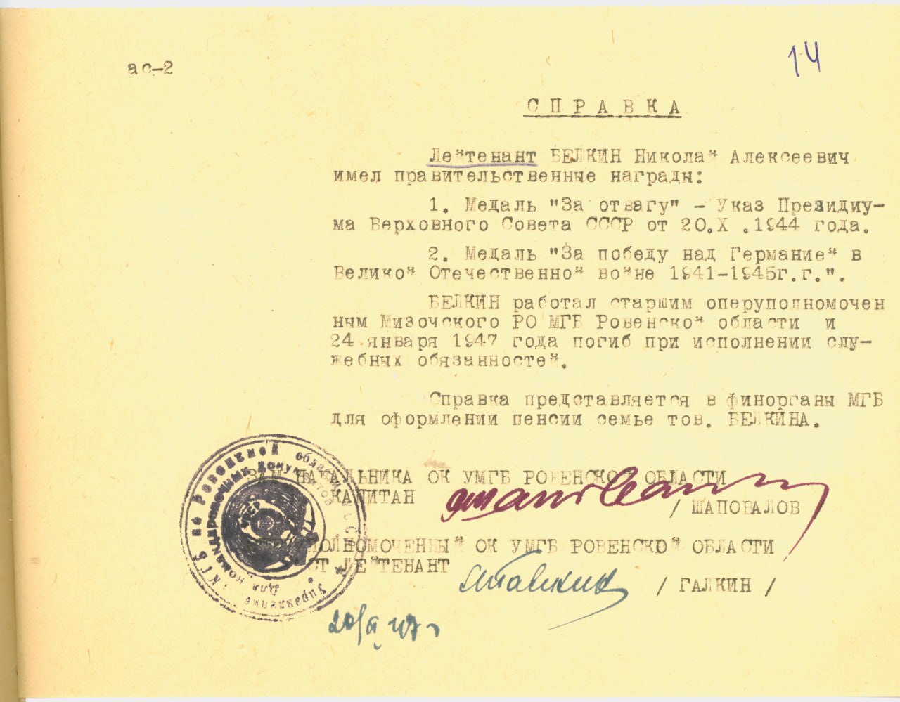 Одним из сотрудников Управления, отдавших жизнь за Победу, является Белкин Николай Алексеевич, 1914 г.р., уроженец деревни Мокрецы Свечинского района Кировской области.