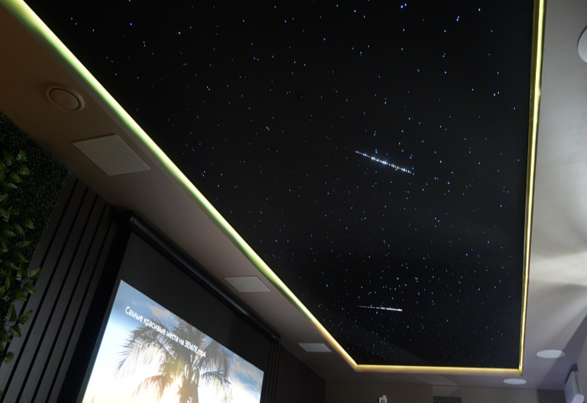 Пространство комнаты организовано с учетом ее основных задач. Для погружения в атмосферу потолок выполнен в виде сияющего звездного неба с падающими кометами. Конструкция потолка позволяет использовать и хромотерапию – воздействие цветом. Его можно выбрать исходя из поставленных задач: например, зеленое и голубое свечение помогает справиться с тревожностью и нарушением сна.