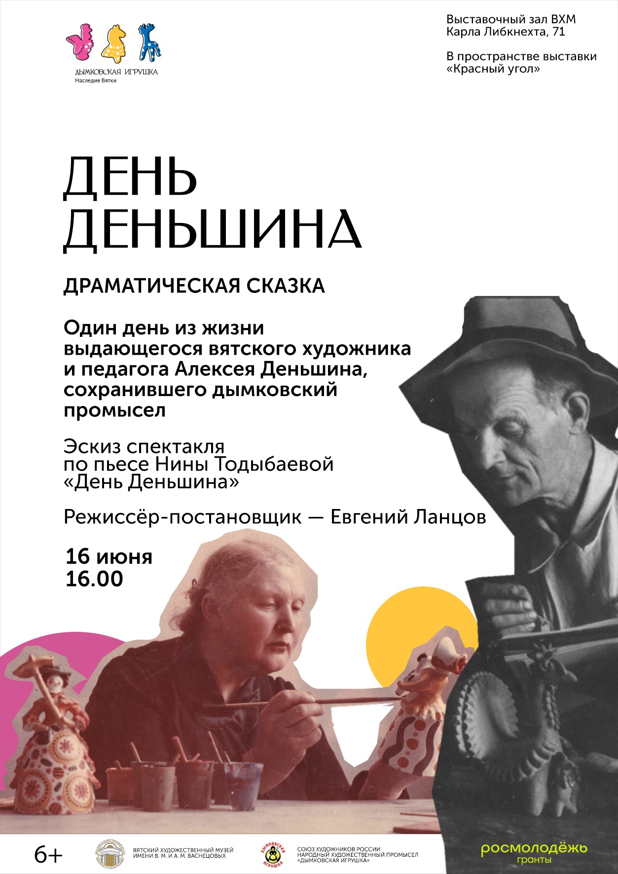 16 июня 16:00 – читка спектакля «День Деньшина» (режиссер-постановщик: Евгений Ланцов) на выставке «Красный угол» в Выставочном зале (Карла Либкнехта, 71). Читка спектакля «День Деньшина» состоится в рамках проекта «Дымковская игрушка. Наследие Вятки», реализуемого при поддержке «Росмолодёжь. Гранты».
