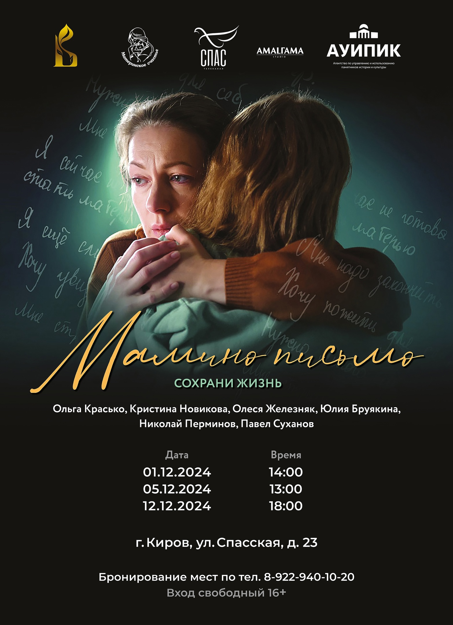 РОО "Возрождение Вятки" приглашает вас в Большой зал ФГБУК АУИПИК "Центр культуры и творчества г. Киров" (ул. Спасская, д. 23, 2 этаж) на бесплатный просмотр кинофильма «Мамино письмо» (16+). Это полнометражный художественно-документальный фильм телеканала "СПАС" о защите и спасении жизней детей до рождения.