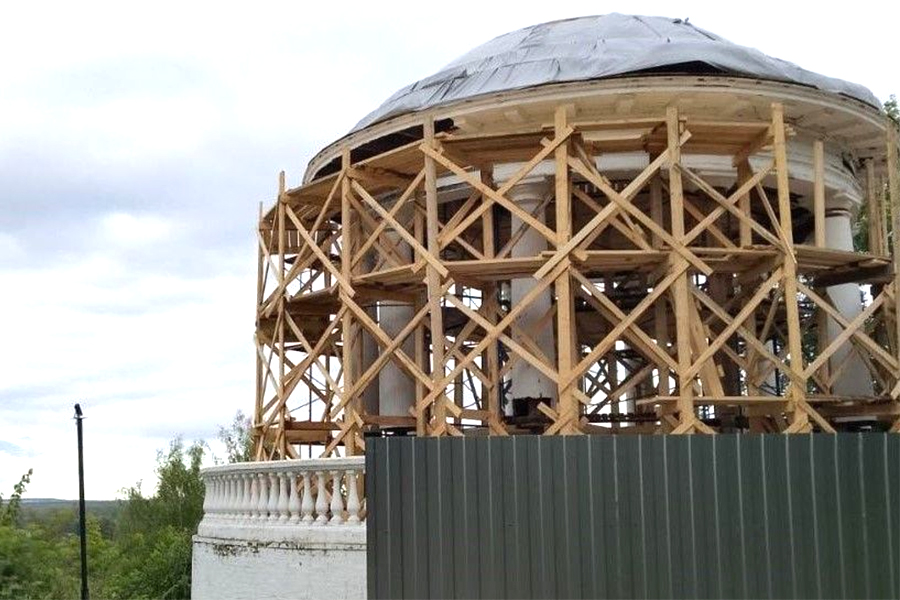 В береговом павильоне продолжаются демонтаж покрытия и сгнивших элементов конструкции, замена кобылки кровли и несущих элементов. Проводятся работы по восстановлению внутренней купольной части с полной заменой облицовочного слоя.
