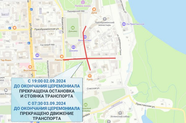 Улица Московская будет перекрыта с 7:30 до окончания церемонии. Более подробно закрытые участки дорог отмечены на представленной карте. Также в отделе транспорта сообщили, что на указанных дорогах вводится запрет на стоянку и парковку транспорта с 19:00 2 сентября.
